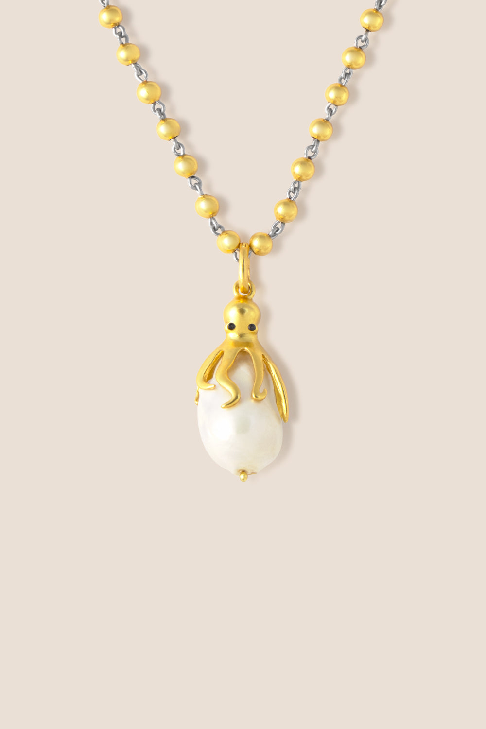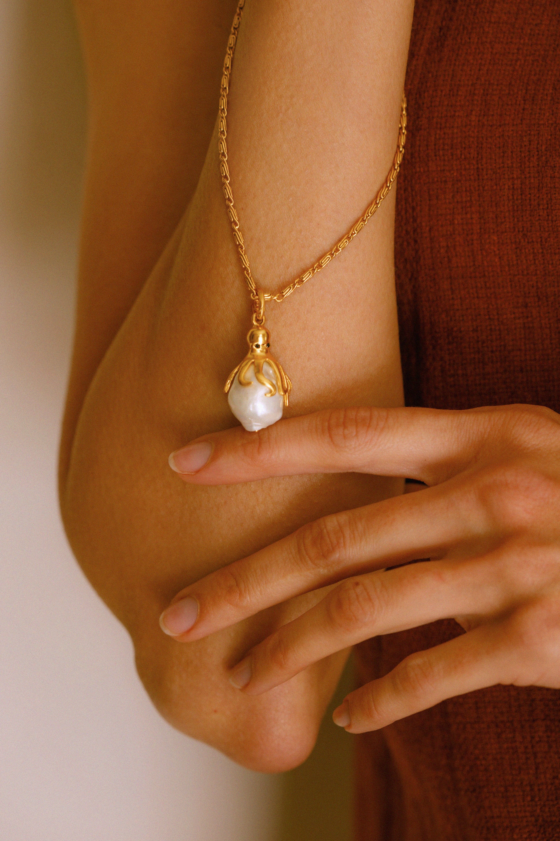 El pulpo en baño de oro aporta calidez y detalle, mientras la perla introduce un brillo suave e irregular que hace que cada pieza sea diferente. Ninguna es igual a otra, lo que convierte este charm en un pequeño objeto singular.