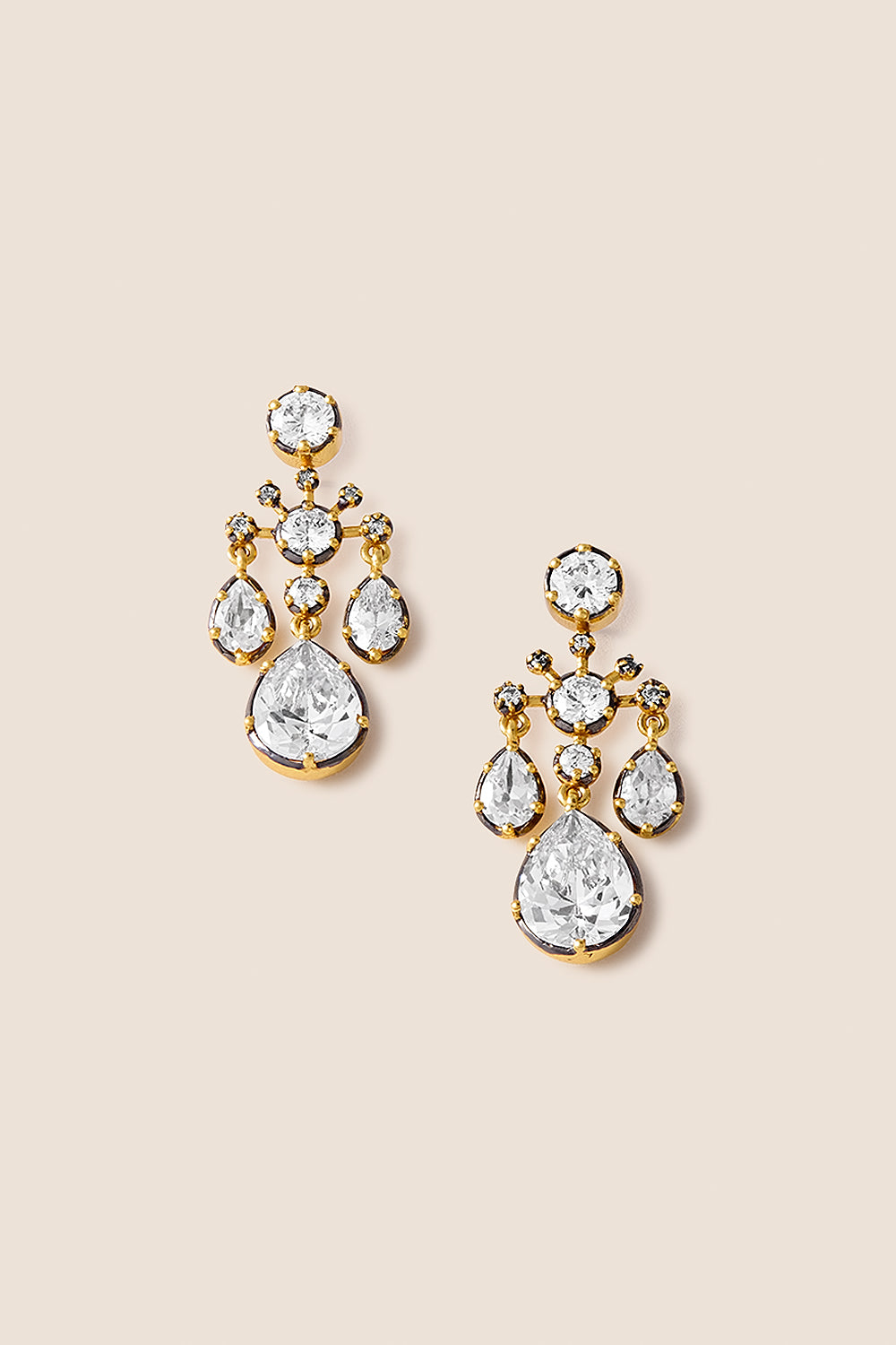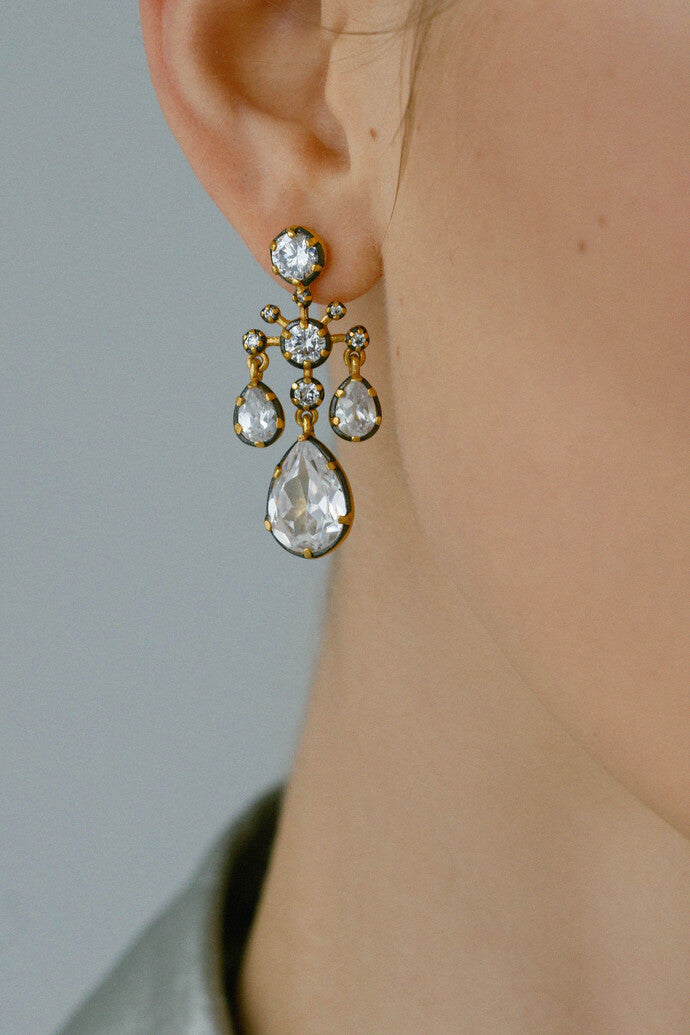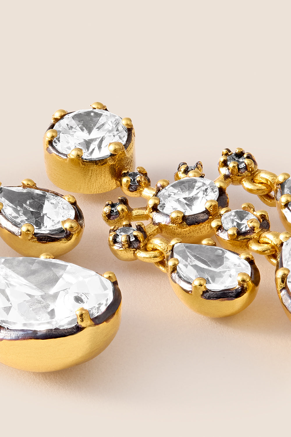 Bianca, una oda a la elegancia clásica: cristales tallados que descienden en armonía hasta una lágrima central, símbolo de sofisticación.. Cada piedra se realza con una sutil línea de rodio que la enmarca delicadamente, intensificando su brillo y resaltando su carácter único.El contraste entre el baño dorado y el resplandor del rodio convierte a esta pieza en un pieza atemporal. Los Bianca no son solo pendientes: son una declaración de estilo que viste de distinción y celebra la feminidad en su máxima expresión.