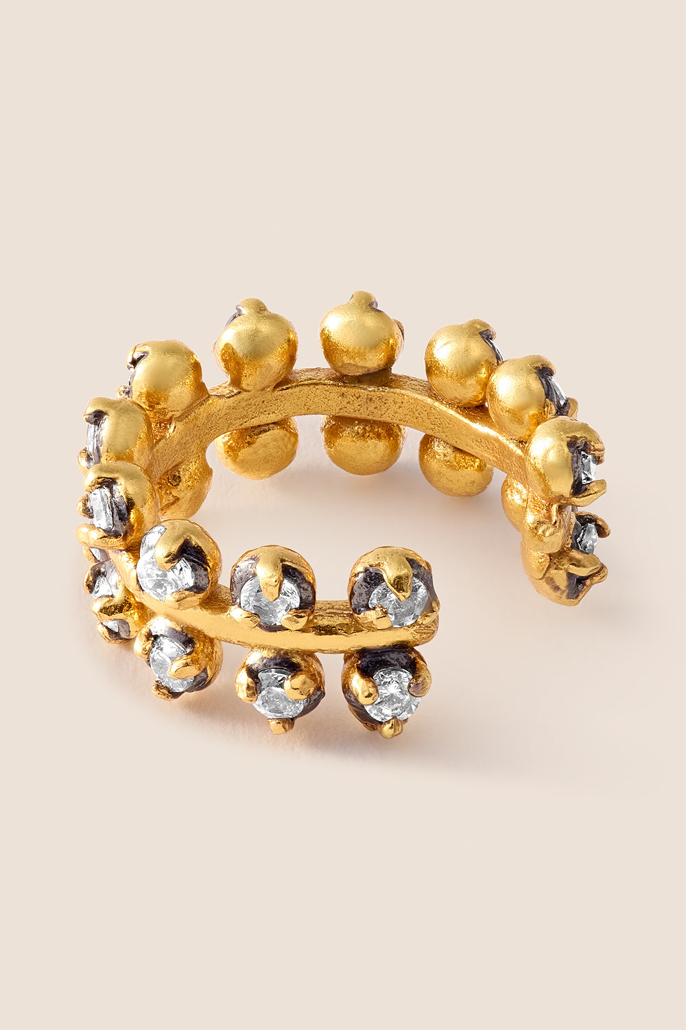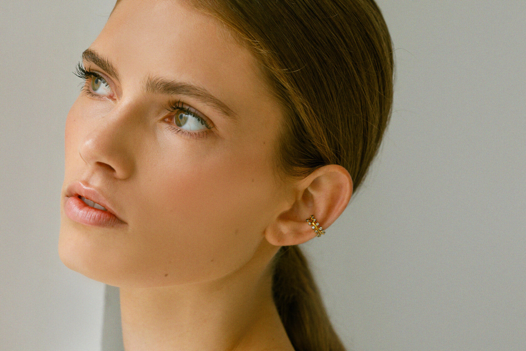 El Air Cuff, pendiente individual, envuelve la oreja con un destello etéreo gracias a sus cristales engastados, sutilmente enmarcados en rodio, se elevan sobre una base de baño en oro de 24k. Su diseño abierto lo convierte en una pieza versátil y sin perforación, ideal para jugar con las alturas de la oreja y crear composiciones únicas.