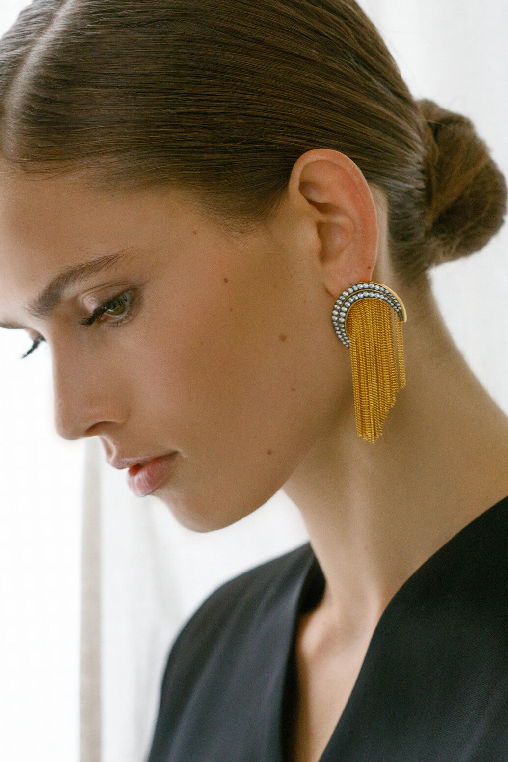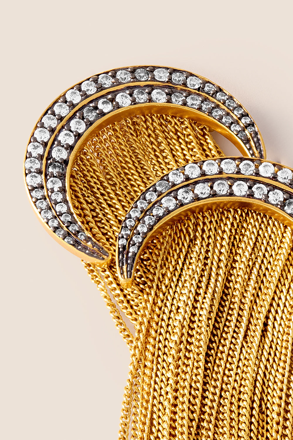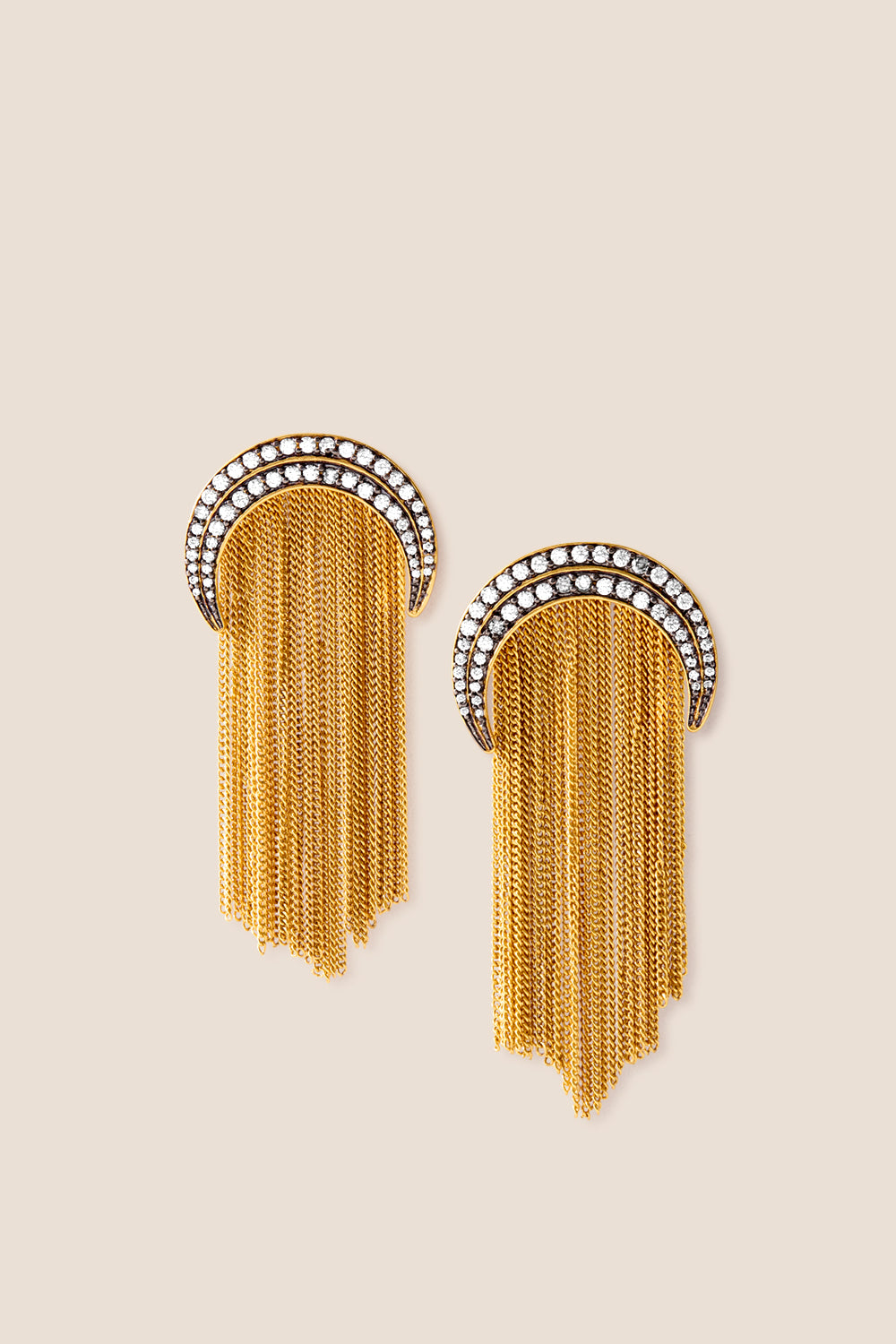 Los pendientes Alice combinan fuerza y movimiento en un diseño único que evoca la elegancia atemporal. Su estructura en forma de media luna, realzada con circonitas engastadas sobre base de rodio con acabado blackish, aporta un contraste sofisticado y luminoso. De cada media luna nacen delicadas mini cadenas bañadas en oro de 24 k, que caen en cascada creando un efecto dinámico. Una pieza diseñada para brillar.