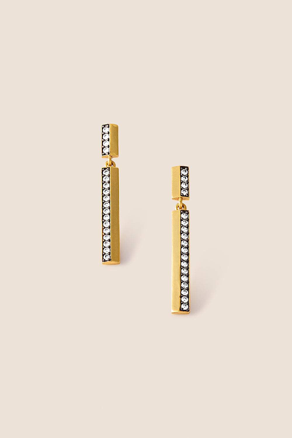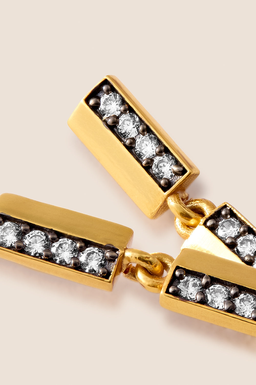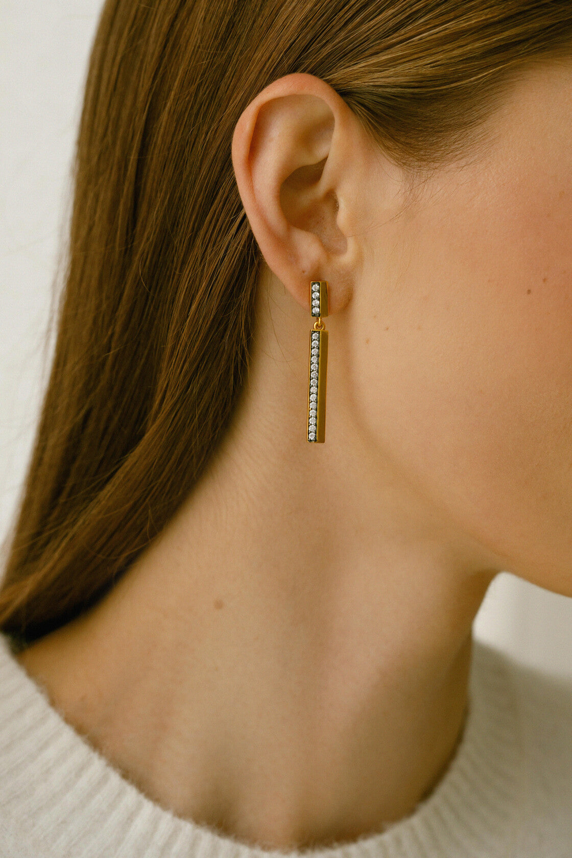 Los pendientes Cova reinterpretan la elegancia en clave contemporánea con su silueta geométrica y depurada. Elaborados en latón con baño de oro de 24 k, presentan dos piezas rectangulares enlazadas que aportan movimiento y alargan visualmente el rostro con sutileza. Cada circonita está delicadamente engastada y enmarcada por el exclusivo rodiado negro de Theodore, un acabado que potencia el brillo de las piedras y aporta un contraste sofisticado. Su diseño minimalista pero impactante los convierte en un accesorio versátil, ideal para elevar cualquier look con un toque de modernidad y distinción.